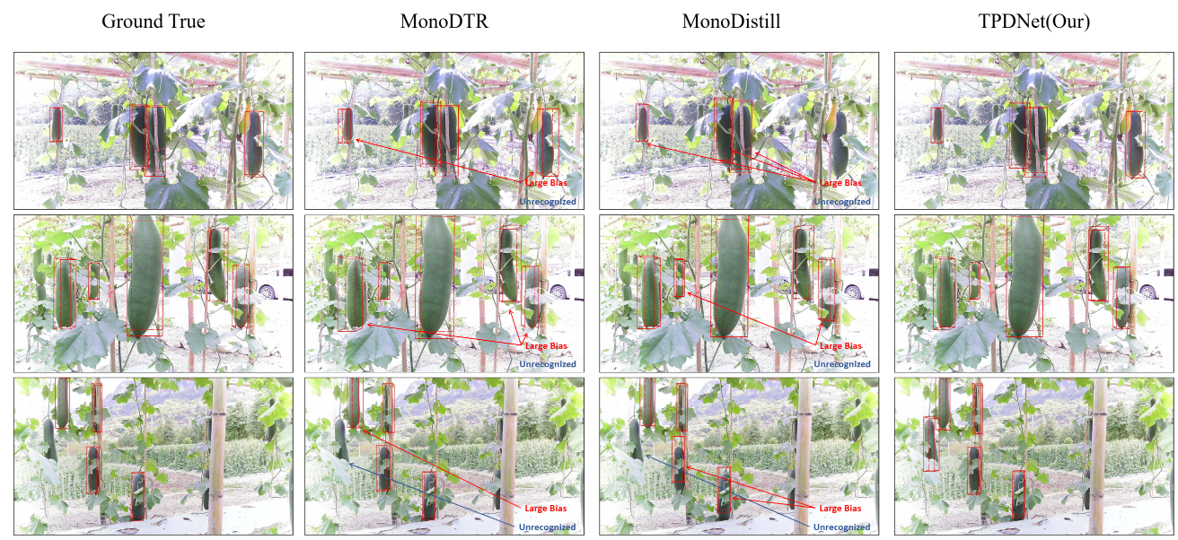 We construct a 3D object detection dataset for wax gourds and propose a network called TPDNet, which aims to capture the 3D information of objects from a single RGB image for fruits and vegetables in fields. Specifically, since a single RGB image lacks spatial depth information, we construct a depth estimation and enhance module that introduces depth information into the model with the help of depth auxiliary labels, and improves the representation of depth information by utilizing weight information across spatial and channel dimensions. Meanwhile, since depth features and image features are heterogeneous, we design the phenotype aggregation and phenotype intensify module to capture the correspondence between image and depth features, promoting the effective fusion of image and depth information. The experimental results show that our method significantly outperforms others, demonstrating the effectiveness and validity of our proposed method..